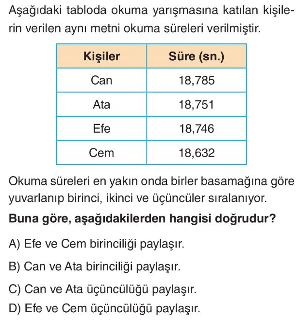 6. Sınıf Ondalık Gösterimlerde Yuvarlama ve Sıralama Test 1