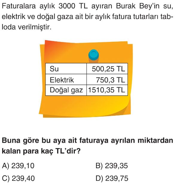 6. Sınıf Ondalık Gösterimlerde Toplama ve Çıkarma İşlemi Test 4