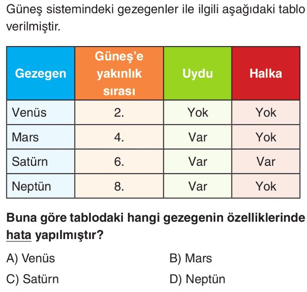 6. Sınıf Güneş Sistemindeki Gezegenler Test 4