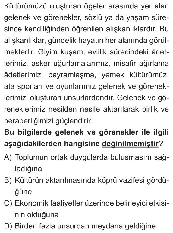 6. Sınıf Kültürel Bağlarımızın ve Milli Değerlerimizin Toplumsal Birlikteliğe Etkisi Test 1