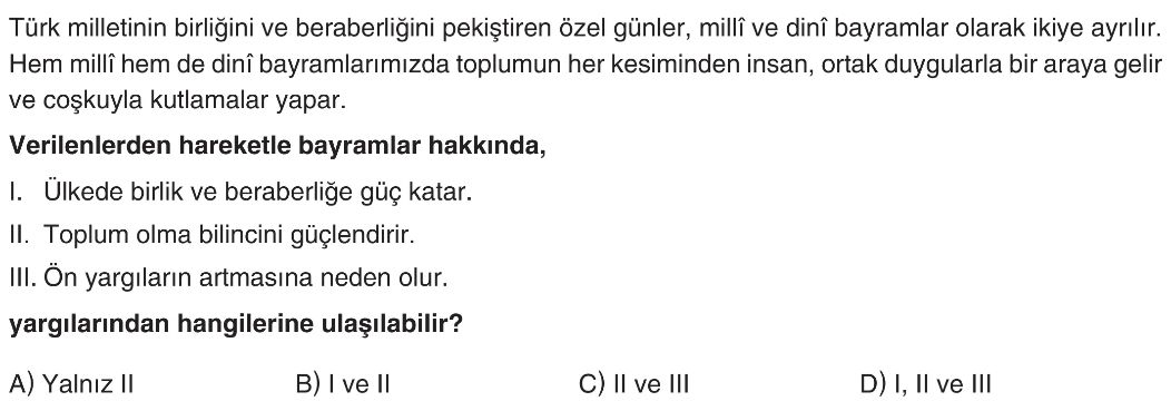 6. Sınıf Kültürel Bağlarımızın ve Milli Değerlerimizin Toplumsal Birlikteliğe Etkisi Test 1