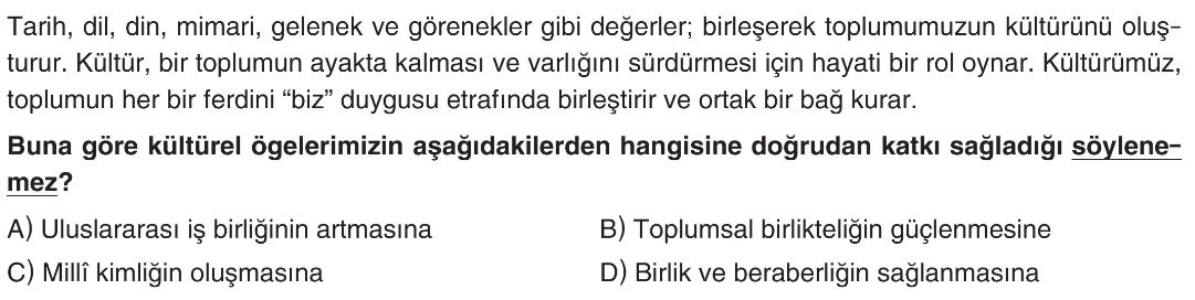 6. Sınıf Kültürel Bağlarımızın ve Milli Değerlerimizin Toplumsal Birlikteliğe Etkisi Test 3