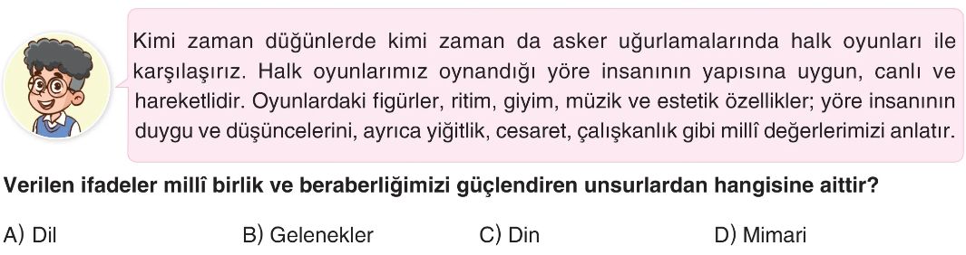 6. Sınıf Kültürel Bağlarımızın ve Milli Değerlerimizin Toplumsal Birlikteliğe Etkisi Test 4