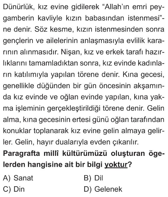 6. Sınıf Kültürel Bağlarımızın ve Milli Değerlerimizin Toplumsal Birlikteliğe Etkisi Test 4