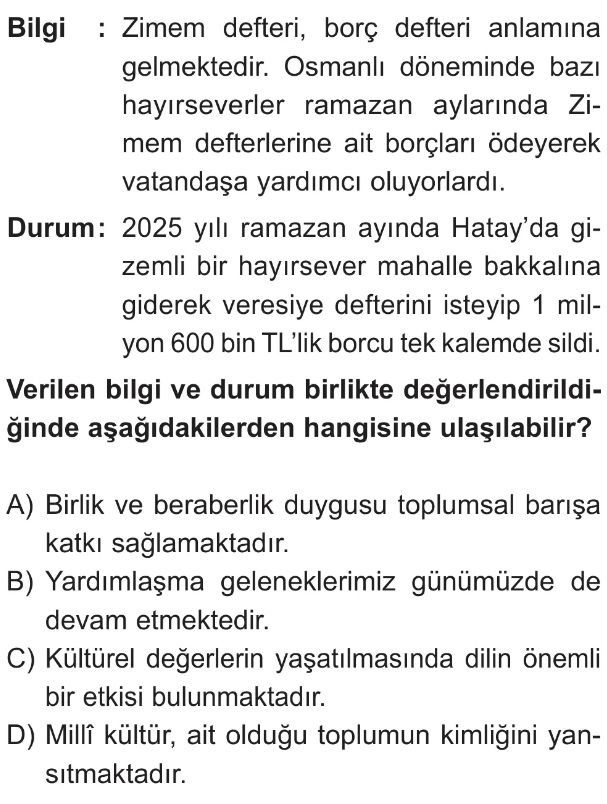 6. Sınıf Kültürel Bağlarımızın ve Milli Değerlerimizin Toplumsal Birlikteliğe Etkisi Test 5