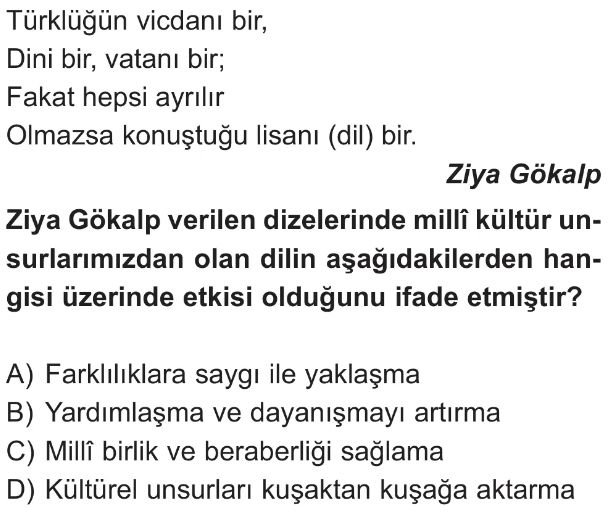 6. Sınıf Kültürel Bağlarımızın ve Milli Değerlerimizin Toplumsal Birlikteliğe Etkisi Test 5
