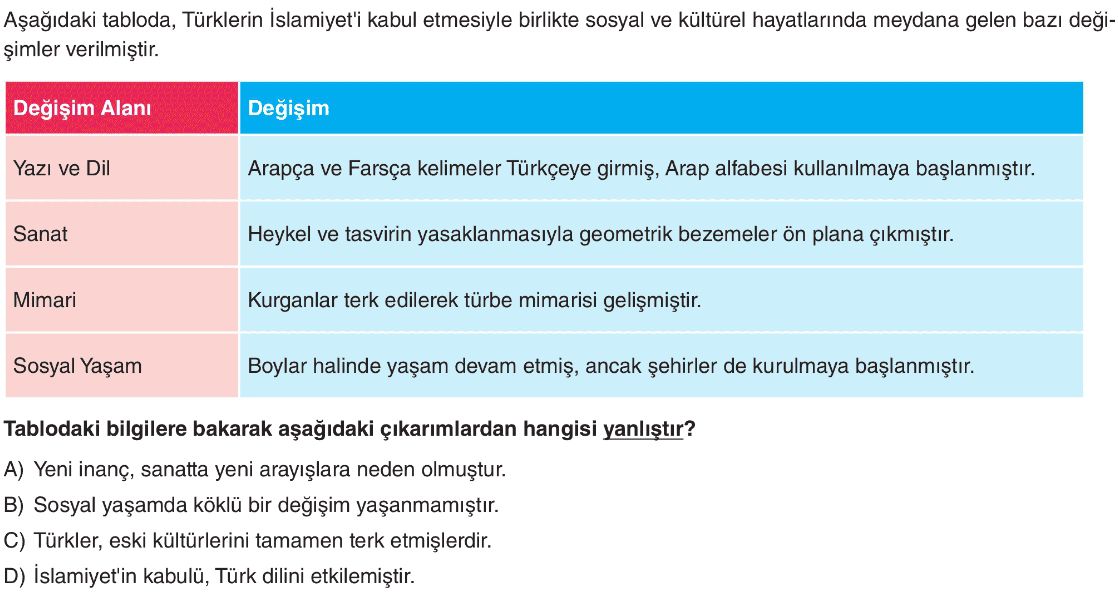 6. Sınıf İslamiyet'in Kabulüyle Türklerin Sosyal ve Kültürel Hayatlarında Meydana Gelen Değişimler Test 1