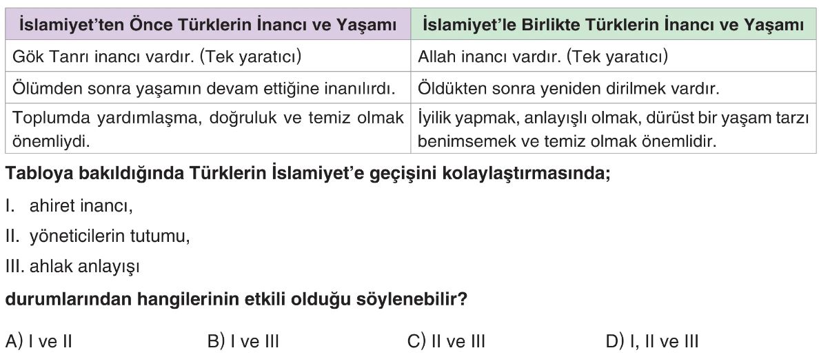 6. Sınıf İslamiyet'in Kabulüyle Türklerin Sosyal ve Kültürel Hayatlarında Meydana Gelen Değişimler Test 1
