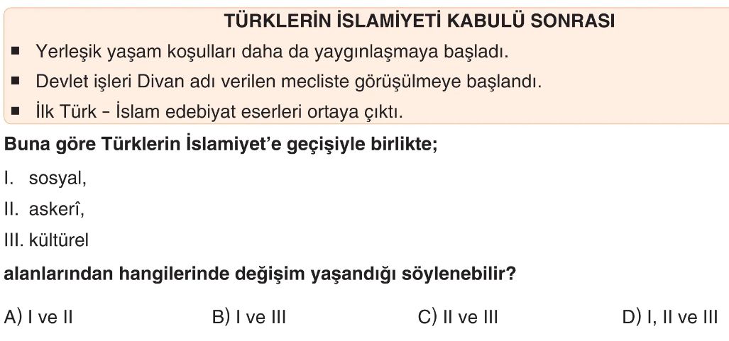 6. Sınıf İslamiyet'in Kabulüyle Türklerin Sosyal ve Kültürel Hayatlarında Meydana Gelen Değişimler Test 1