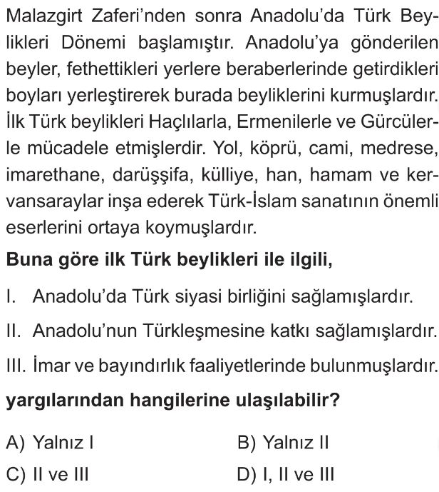 6. Sınıf XI-XIII. Yüzyıllar Arasında Meydana Gelen Askerî Mücadelelerin Anadolu'nun Türkleşmesi ve İslamlaşmasına Katkıları Test 4