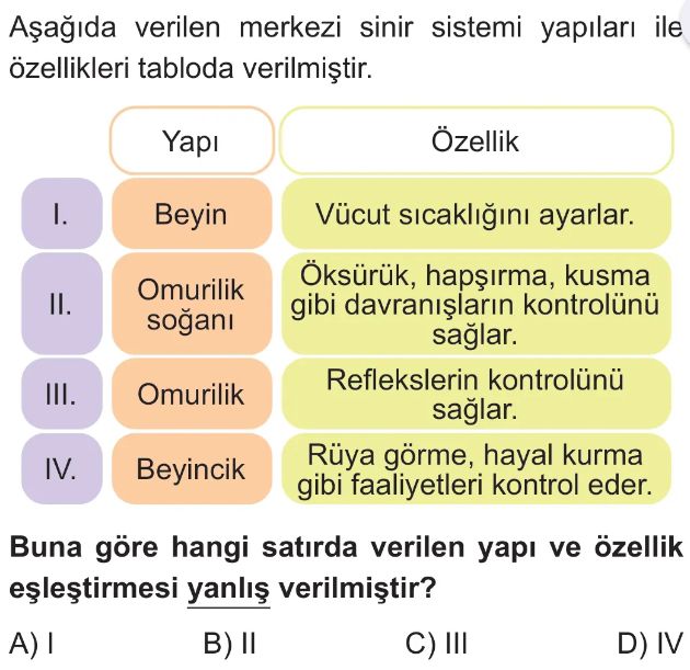 6. Sınıf Sinir Sisteminin Görevleri Test 1