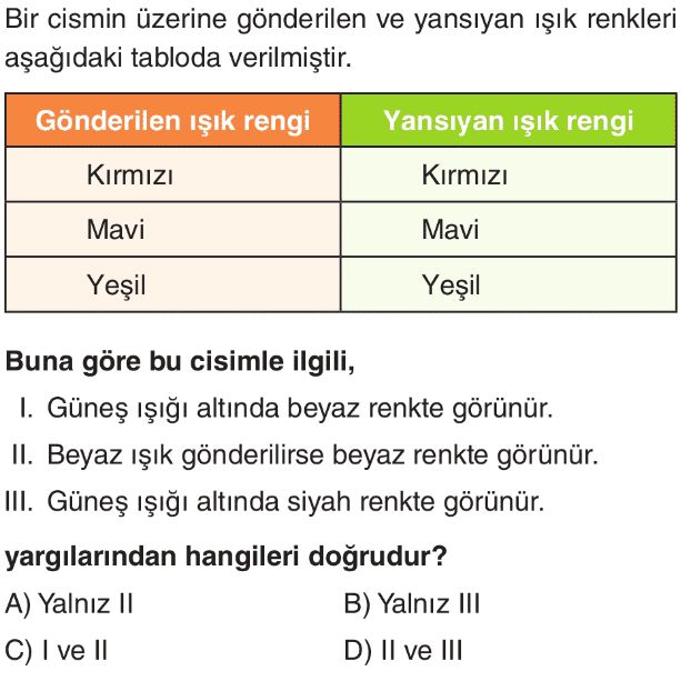 6. Sınıf Beyaz Işık ve Renkler Test 1