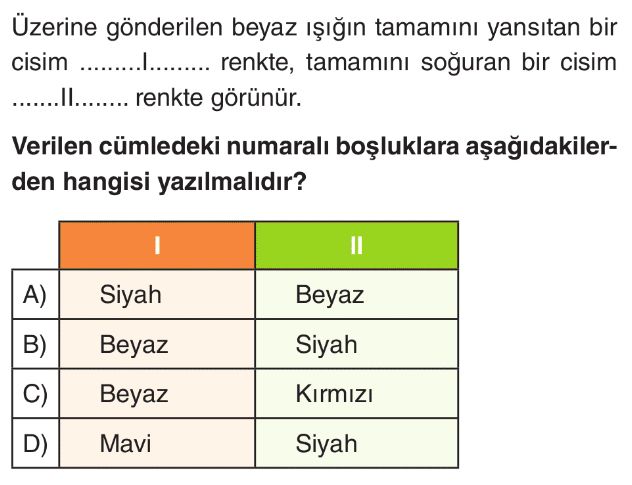 6. Sınıf Beyaz Işık ve Renkler Test 2