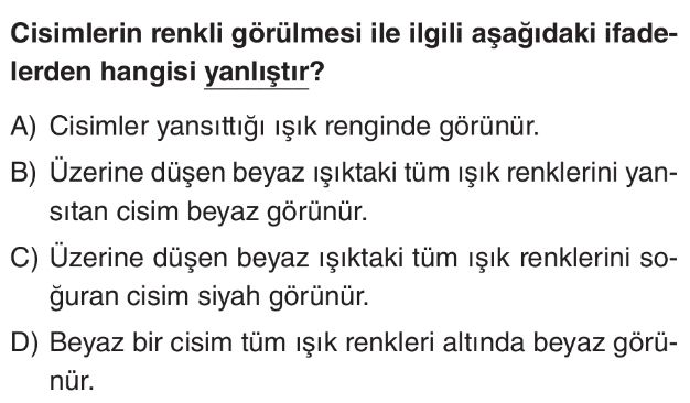 6. Sınıf Beyaz Işık ve Renkler Test 3