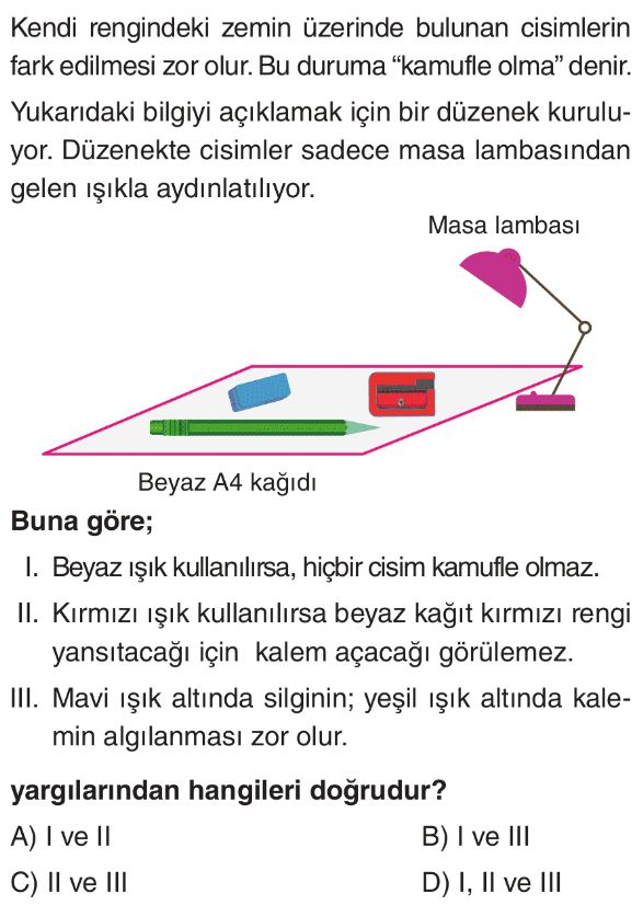 6. Sınıf Beyaz Işık ve Renkler Test 4