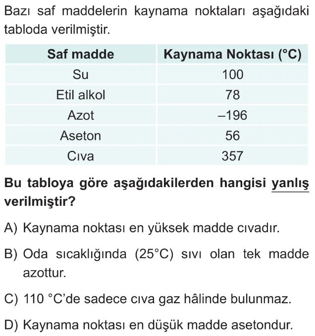 6. Sınıf Maddenin Hâl Değişim Noktaları Test 1