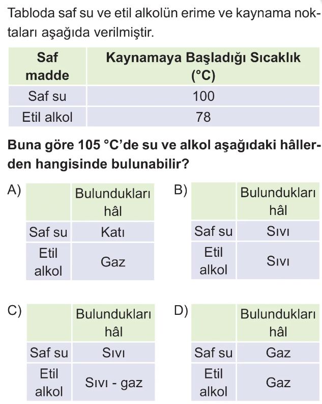 6. Sınıf Maddenin Hâl Değişim Noktaları Test 1