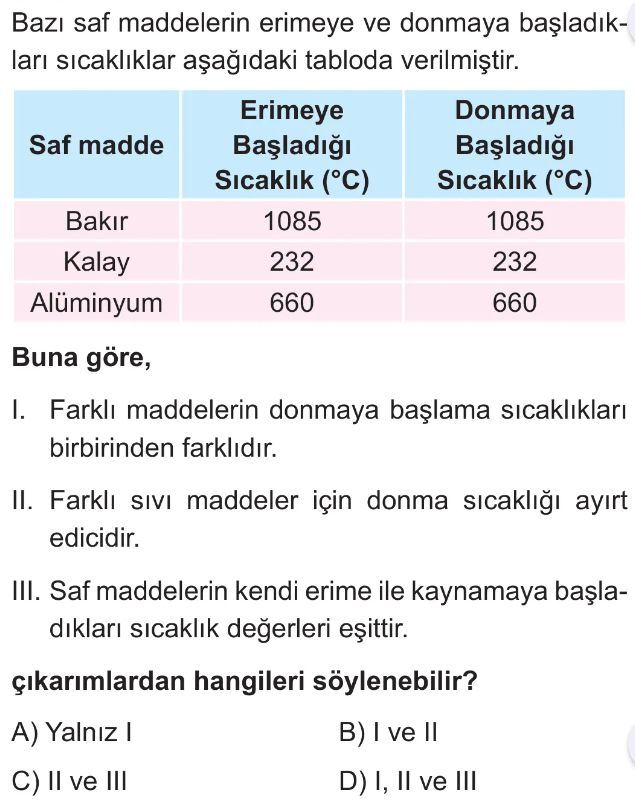 6. Sınıf Maddenin Hâl Değişim Noktaları Test 3