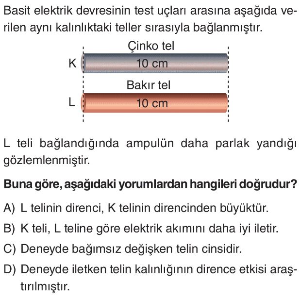 6. Sınıf Elektriksel Direnç ve Bağlı Olduğu Faktörler Test 8