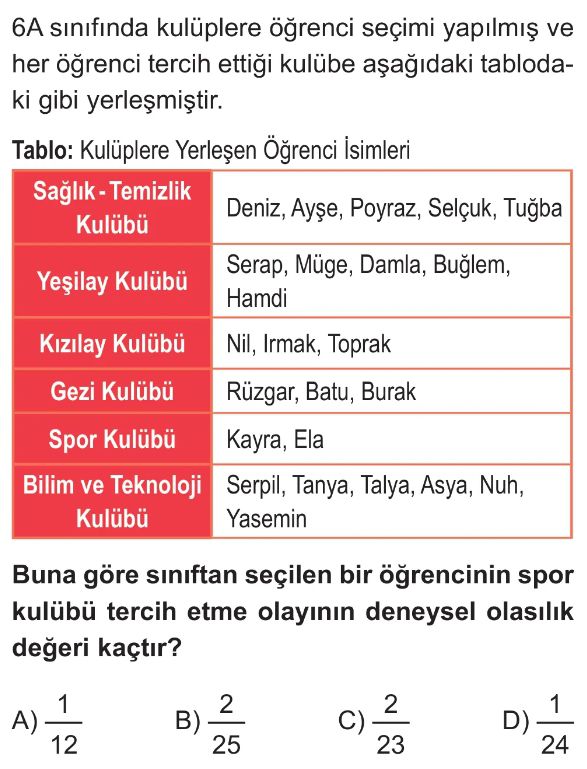 6. Sınıf Bir Olayın Olasılığını Gözleme Dayalı Tahmin Etme Test 6