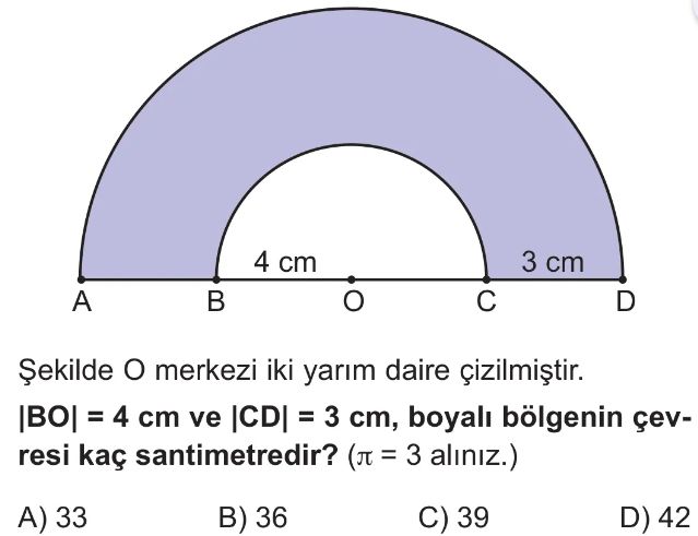 6. Sınıf Çemberde Merkez Açı ve Açının Gördüğü Yayın Uzunluğu Test 3