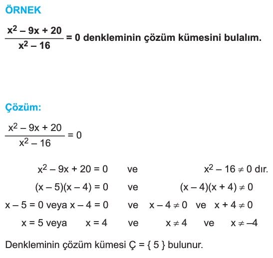 - Rasyonel Denklemler: P(x) ve Q(x) birer polinom ve Q(x) ≠ 0 olmak üzere, P(x)/Q(x) = 0 biçimindeki denklemlere rasyonel denklemler denir. Rasyonel denklemin çözüm kümesi bulunurken payın kökleri bulunur. Bulunan değerler arasında paydayı sıfır yapan değerler varsa bu değerler çözüm kümesine alınmaz.