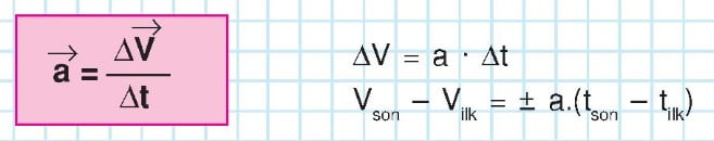 Burada ivmenin önündeki + işareti hızlanan, – işareti de yavaşlayan hareketler içindir. Hareketi gözlemlemeye başladığımız anı zamanın başlangıcı olarak alırsak tilk = 0 olur.