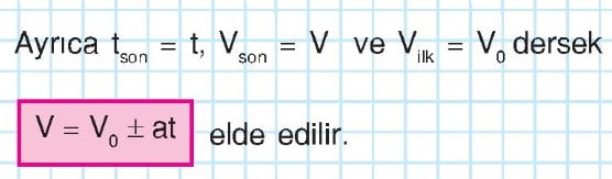 Bu denklem ivmesi a olan bir cismin hızının V0 olduğu andan t süre sonraki hızını bulmaya yarayan bağlantıdır.