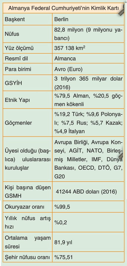 Nüfusu 82 milyonu geçen Almanya’da diğer gelişmiş ülkelerde olduğu gibi nüfus artış hızı oldukça düşük, ortalama yaşam süresi ve medyan yaş fazla, kentleşme oranı yüksektir. En önemli şehirleri; başkent olan Berlin ile Münih, Köln ve Hamburg’dur.