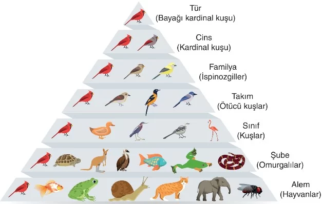 Bu piramit, canlıların hiyerarşik sınıflandırmasında tür, cins, familiya, takım, sınıf, şube ve aleme doğru ilerledikçe benzerliklerin azaldığını açıkça gösterir.