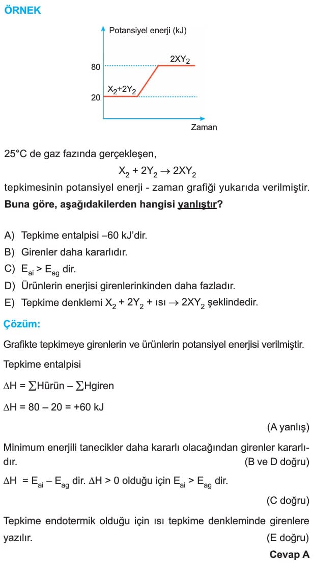 Çözüm: Negatif bir entalpi değişimi (-150 kJ/mol), tepkimenin ekzotermik olduğunu ve ısı açığa çıktığını gösterir. Cevap A.