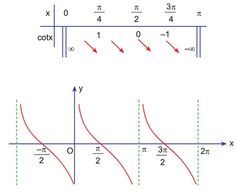 f(x) = cotx fonksiyonunun periyodu π’dir. f(x) = cotx fonksiyonu x = 0 ve x = π değerlerinde tanımsız oldugundan grafik, x = 0 ve x = π doğrularını kesmez.