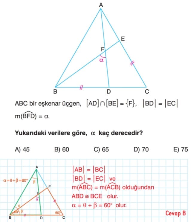Bir üçgende iki kenar sırasıyla 5 cm ve 7 cm, aralarındaki açı ise 60°’dir. Bu üçgenle eş olan başka bir üçgenin aralarındaki açı ölçüsü nedir?
