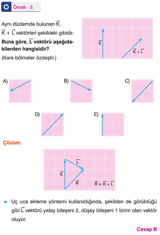 Çözüm: K ve P vektörleri uç uca eklendiğinde N vektörünü oluştururlar. K ve M vektörleri paralelkenar üzerinde oldukları için büyüklük olarak eşit fakat vektörel olarak zıttırlar.