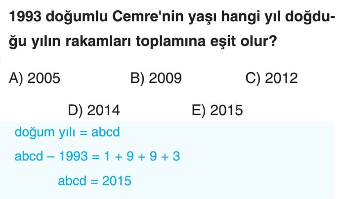 Örnek: Ceren 3 yıl önce, ablası Ezgi 1 yıl sonra doğsaydı yaşları farkı 8 olacaktı. Ceren ile Ezgi’nin bugünkü yaşları toplamı 26 olduğuna göre, Ezgi’nin bugünkü yaşını bulalım.
