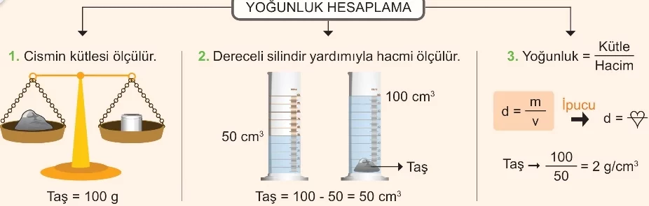 Yoğunluk ($d$), kütle ($m$) bölü hacim ($V$) formülüyle hesaplanır: