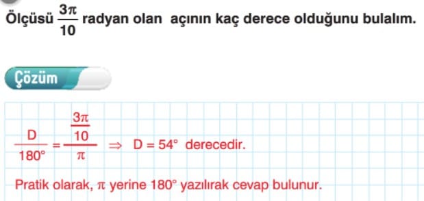 - Bir çemberdeki merkez açının kaç radyan olduğunu bulmak için o merkez açının gördüğü yayın uzunluğu, yarıçap uzunluğuna bölünür.