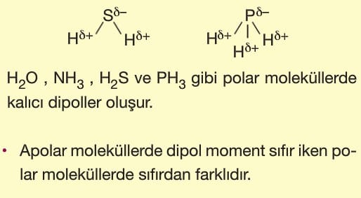 Örneğin: H2O, NH3, HCI, HF, H2S, PH3 ve PCI3 gibi moleküllerin molekül geometrisine bakıldığında polar moleküller oldukları görülür.